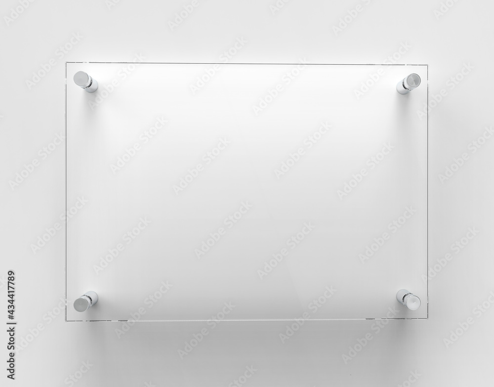 Blank A4 transparent glass office corporate Signage plate Mock Up Template, Clear Printing Board For Branding, Logo. Transparent acrylic advertising signboard mockup front view. 3D rendering #434417789