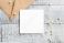 Blank square wedding invitation card mockup with dry white flax flowers decor on wooden background, top view with copy space #1307749473