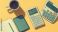 Budget flat lay with laptop notebook calculator smartphone coffee cup glasses and financial statement reports on blush pink to sky blue gradient pastel background #1487489479