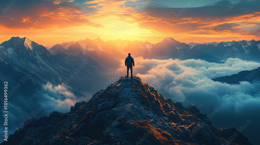 businessman standing in a heroic pose atop a mountain peak pioneering of new paths and the attainment of business heights perseverance leadership and the spirit of entrepreneurship.illustration #1016499362