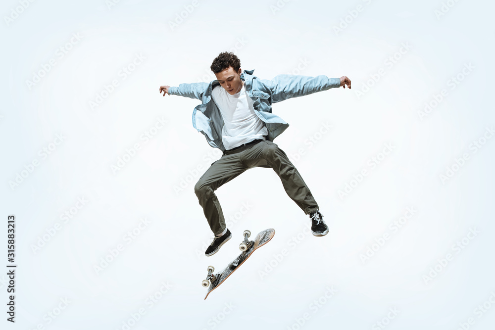 Caucasian young skateboarder riding isolated on a white studio background. Man in casual clothing training, jumping, practicing in motion. Concept of hobby, healthy lifestyle, youth, action, movement. #315883213