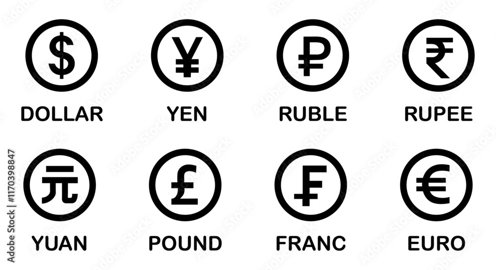 Collection of most popular currency symbol isolated on white background. Currency signs: dollar, yen, ruble, rupee, yuan, pound, franc and euro. Simple design of the most popular currency. Banknotes. #1170398847