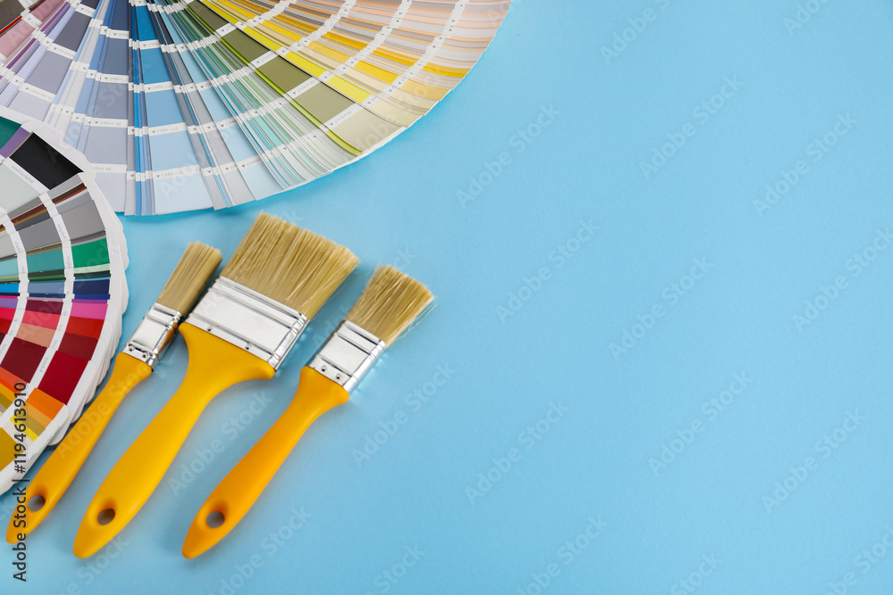 Color selection charts and paint brushes on light blue table, space for text. Decorating and design #1194613910
