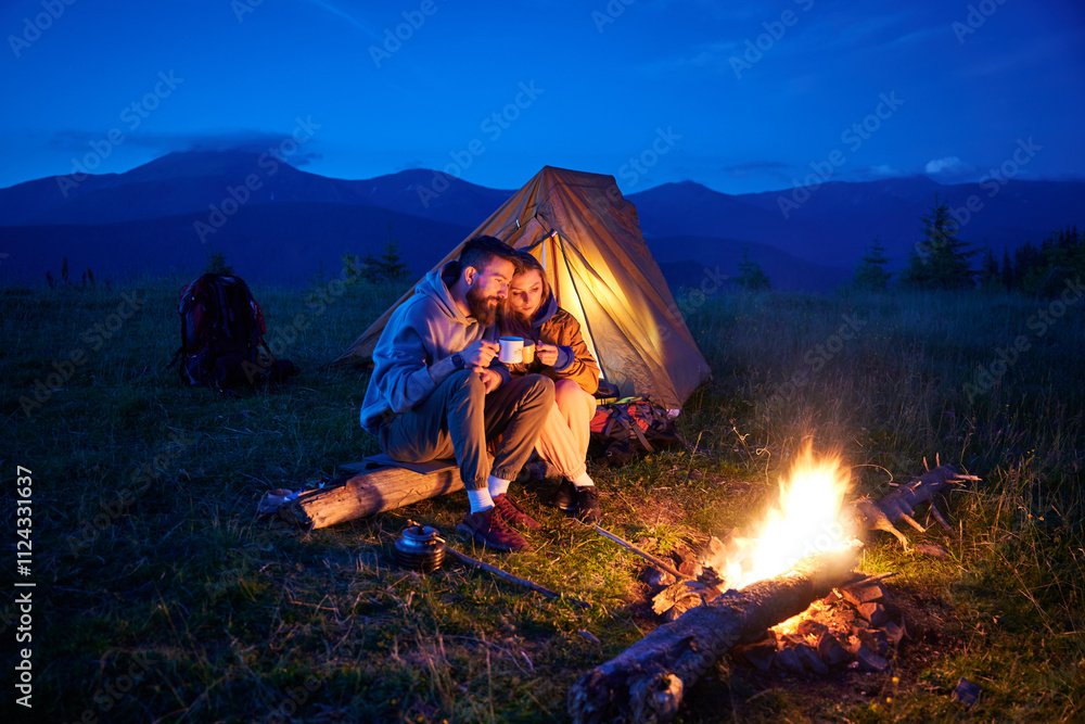 Couple hikers enjoys cozy moment by campfire, sipping hot drinks near glowing tent. Twilight sky and mountain backdrop create serene and romantic atmosphere in picturesque wilderness setting. #1124331637