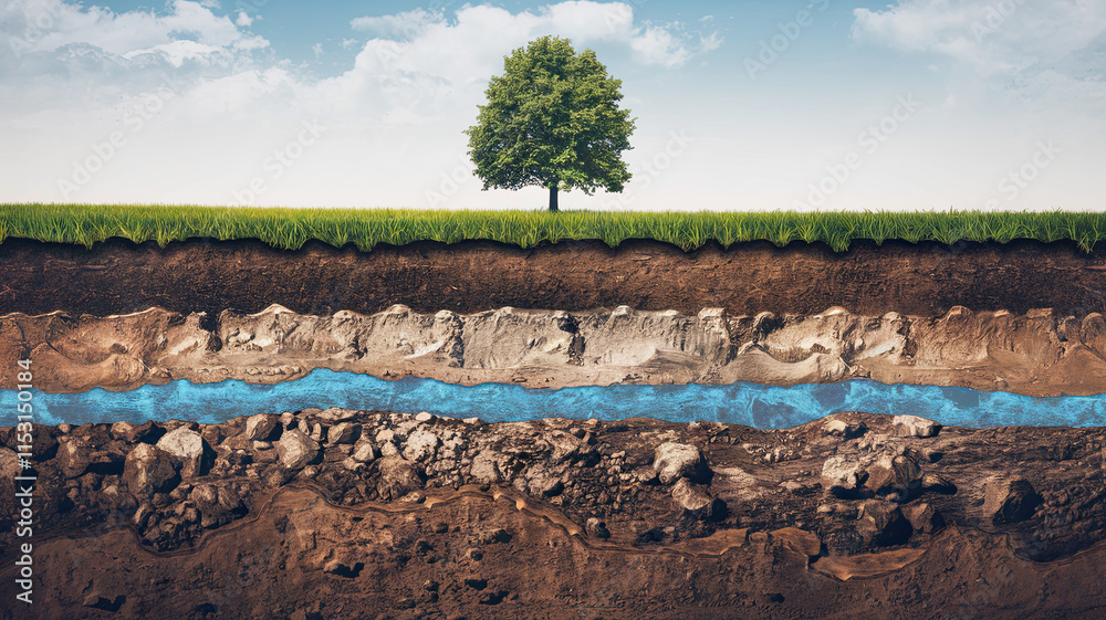 Cross-Sectional View of the Ground Layers, Lush Green Grass with Solitary Tree, Dark Soil, Sandy Soil, Rocky and Clayey Layers, Blue Water Layer, Detailed Geological Composition #1153150184