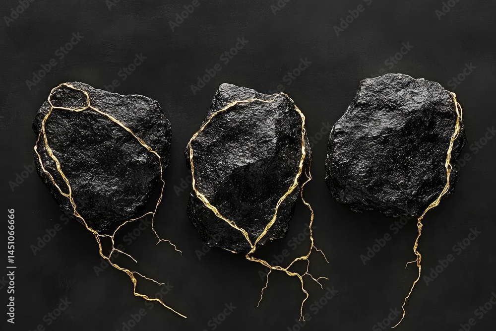 Dark stones, gold veins. Three rough black stones, each with a network of gold veins or roots, forming a decorative arrangement on a black background #1451066666