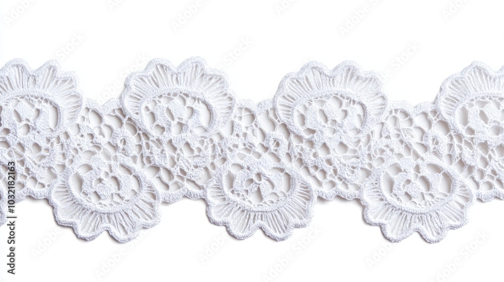 delicate vintage white lace trim with floral pattern, isolated on a white background in a flat lay design, featuring soft cotton lace details, perfect for fashion or crafting projects #1032182163