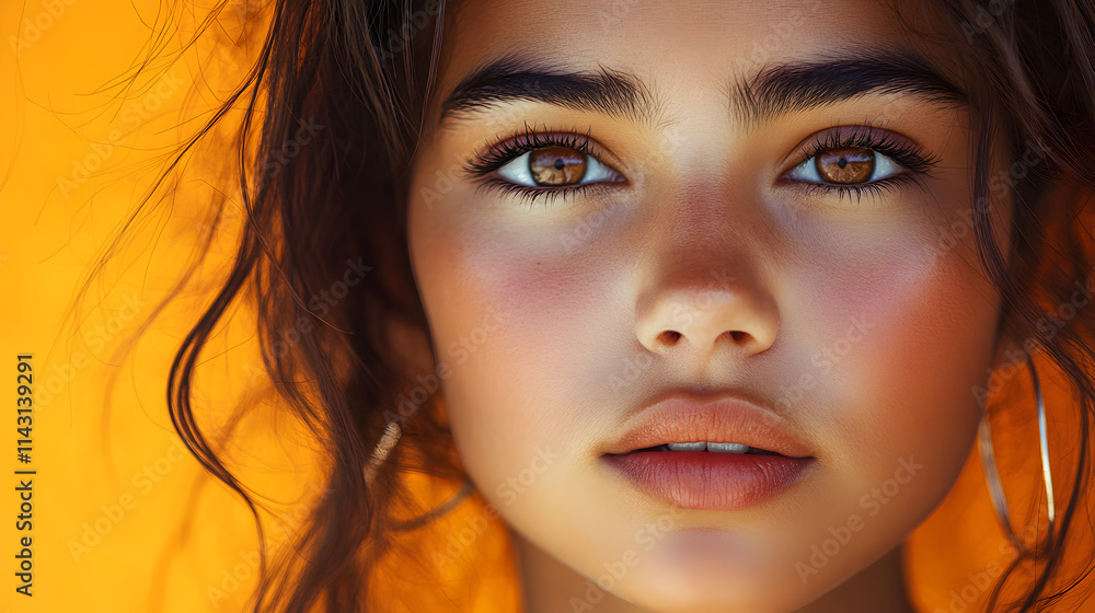 el rosto de una mujer adolecente joven latina morena con ojos color miel mirando a la camara con una mirada cautivadora #1143139291