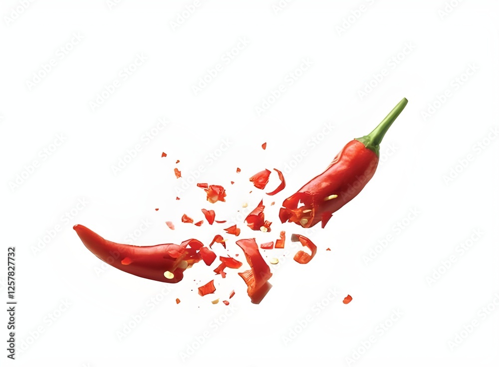 Exploding Red Chili Pepper with Spicy Fragments on White Background – Fiery Food Concept #1257827732