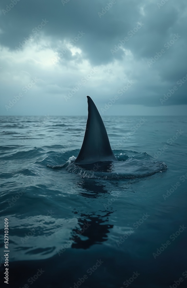 fin breaks ocean surface under dramatic moody sky. Marine wildlife silhouette against stormy seascape. Mysterious dangerous predator lurking in deep sea. Symbol of power, adventure and risk. #1527103009