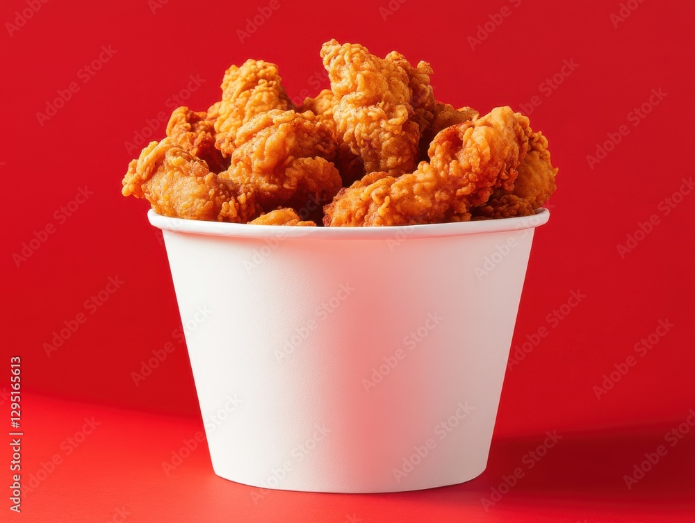 fried chicken in a pure white bucket with French fried in clean red background #1295165613
