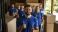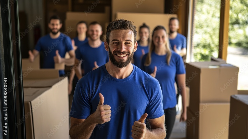 Group of cheerful movers clad in matching blue shirts displaying thumbs up while standing among numerous cardboard boxes ready for relocation #1098840241