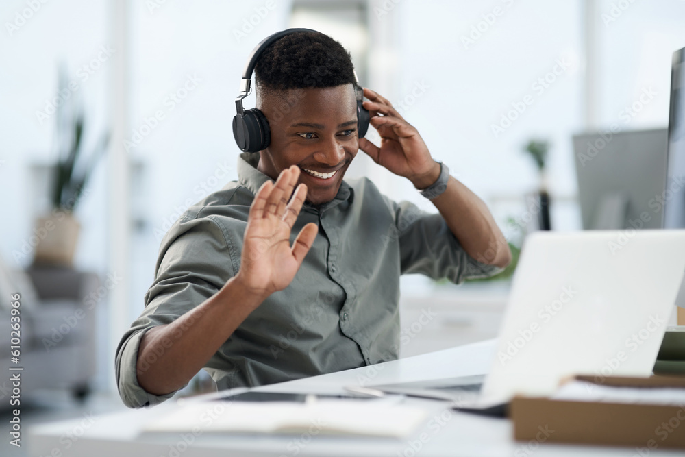 Happy black man, laptop and video call with headphones for webinar, virtual meeting or introduction at the office. Friendly African male person, consultant or agent smiling with headset for seminar #610263966