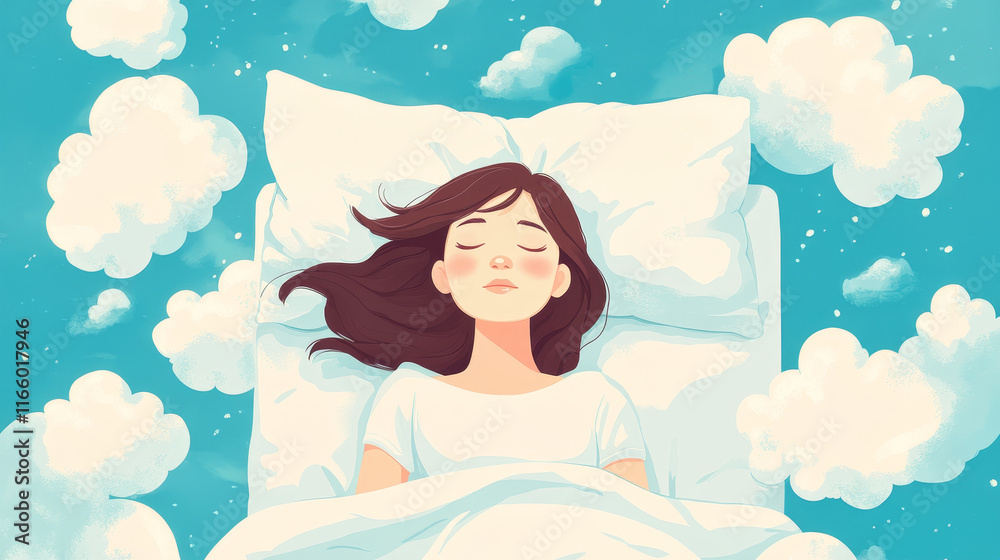 How to create a better sleep cartoon ad poster. Young woman lying on pillows in bed top view, dormant girl nap at home or hotel, relaxing and sleeping with fluffy clouds around, vector illustration #1166017946
