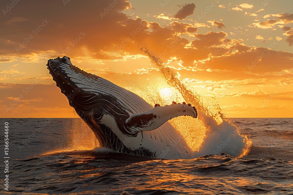 Humpback whale breaching against golden sunset sending massive splash into ocean magnificent specie once devastated commercial whaling seen dramatic population increase due marine conservation effort #1366544680