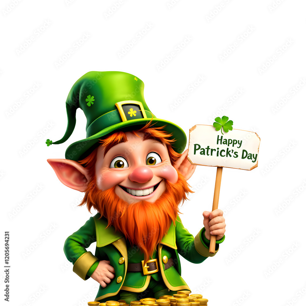Leprechaun character in green suit and hat with clover holding sign with happy patricks day on transparent background #1205694231