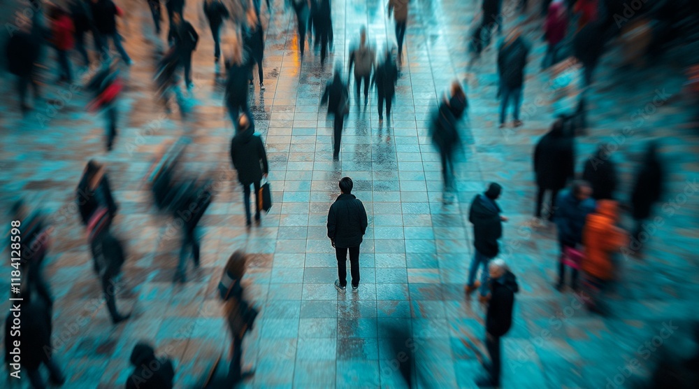Lone Figure in a Crowd Experiencing Social Anxiety in a Busy Urban Setting #1184128598