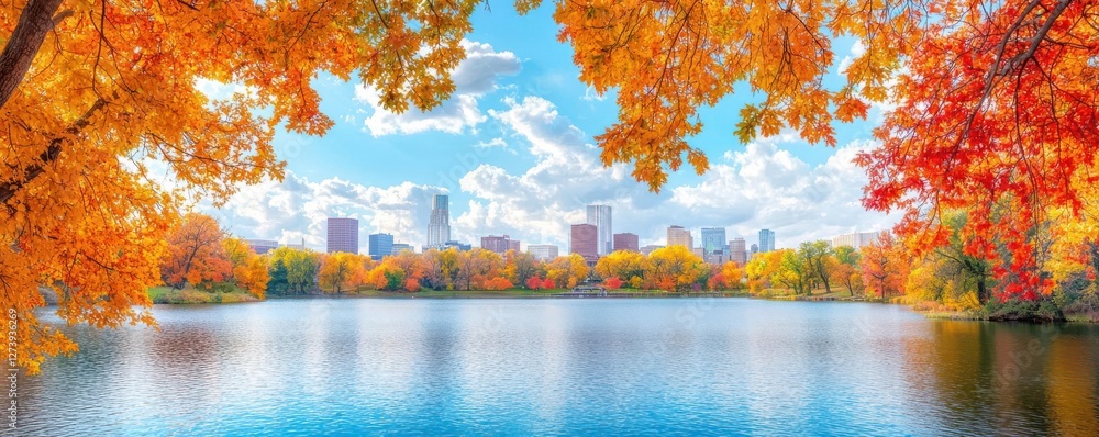 Loring Park in Minneapolis during fall, with a picturesque lake and colorful trees framing the scene #1273936269