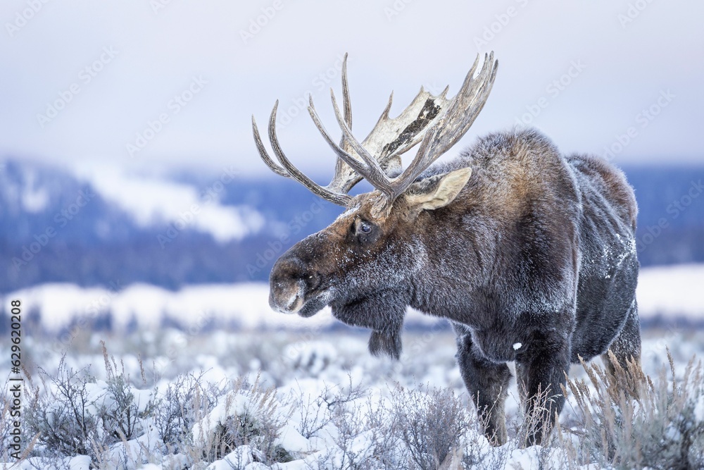Majestic moose is resting in a tranquil wintery landscape, featuring a snow-covered field #629620208