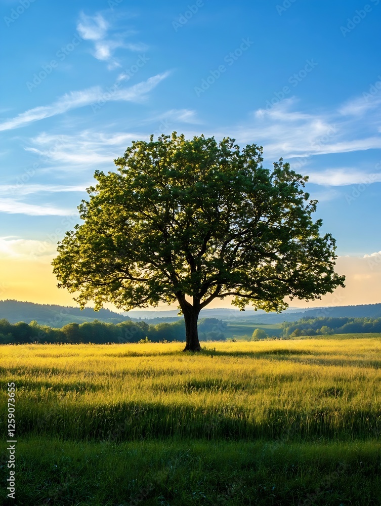 Majestic solitary tree standing in a golden field under a bright blue sky : Generative AI #1259073655