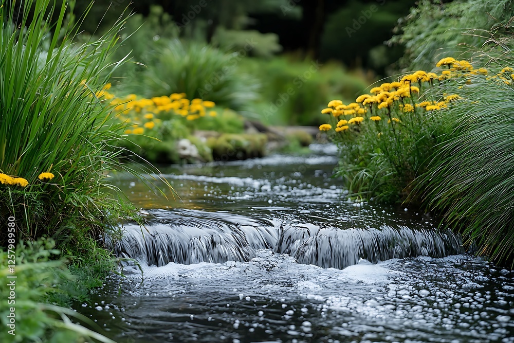 Pair of ducks swimming in a small stream surrounded by reeds #1257989580