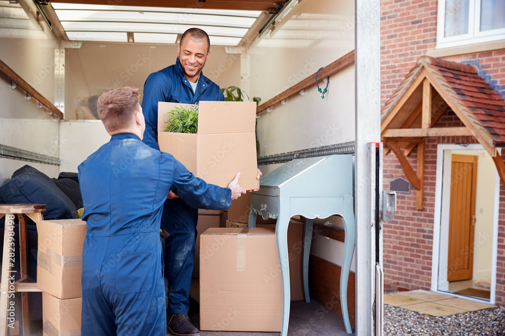 Removal Company Workers Unloading Furniture And Boxes From Truck Into New Home On Moving Day #282398498