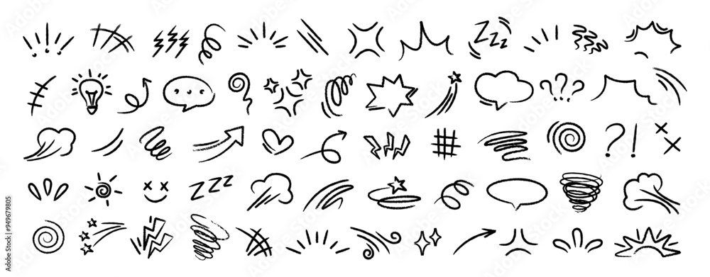 Set of black hand drawn anime manga doodle grunge line elements curved charcoal, chalk arrows, speech bubble, abstract shapes, graphic effects for character emotion. Scribble stroke symbols vector #949679805