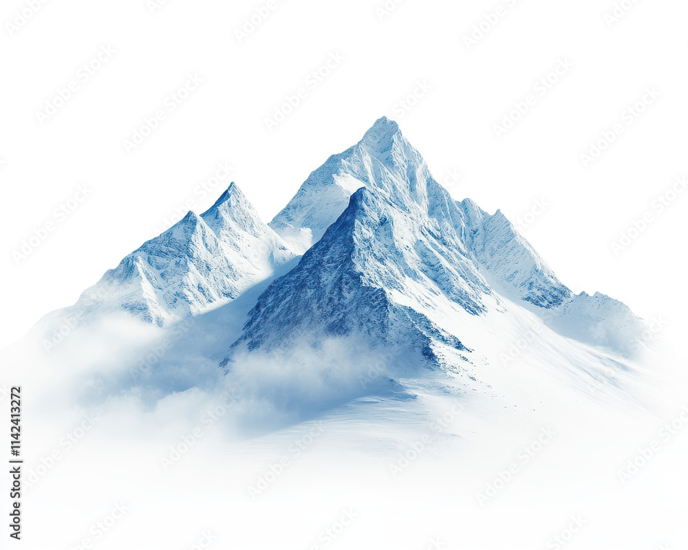 Snow-covered mountain peak with clouds on a white isolated background. #1142413272