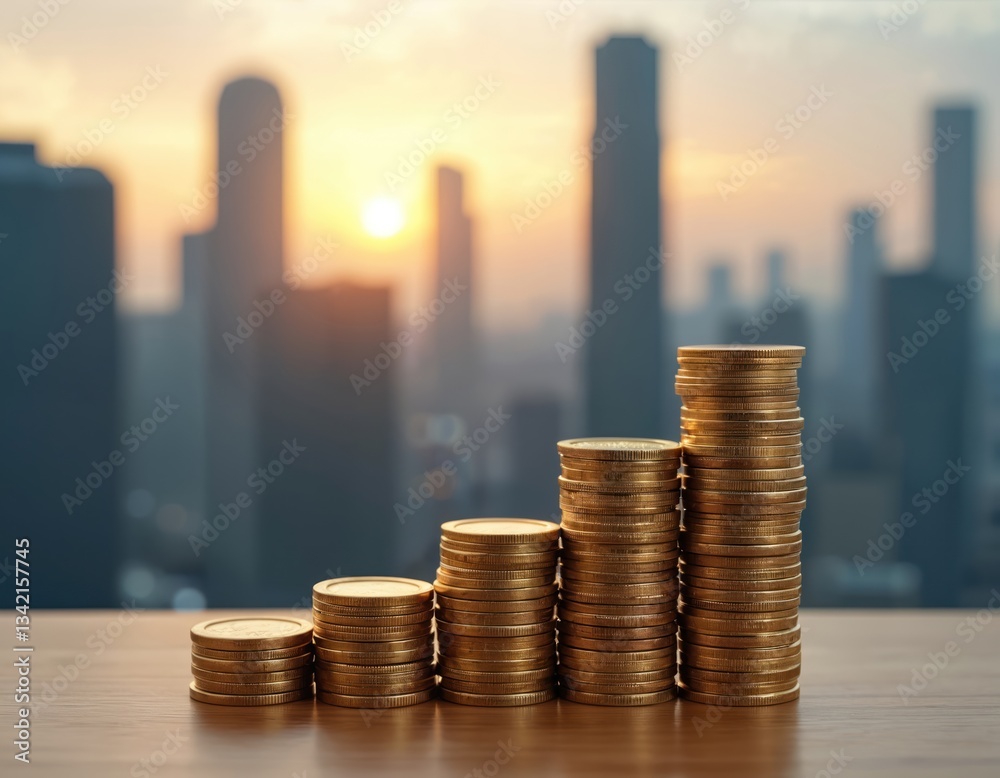 Stacks of golden coins on table symbolize financial growth, investment returns. Blurred cityscape and sunset background. Shows capital expenditure management, asset efficiency and financial planning. #1342157745