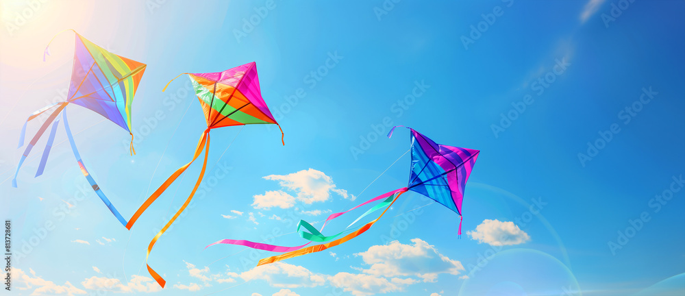 Three colorful kites flying in the sky on a sunny day. The kites are of different colors and sizes. Concept of joy and freedom. rainbow coloured kites with rainbow ribbons flying in the sky, sunny day #813728681