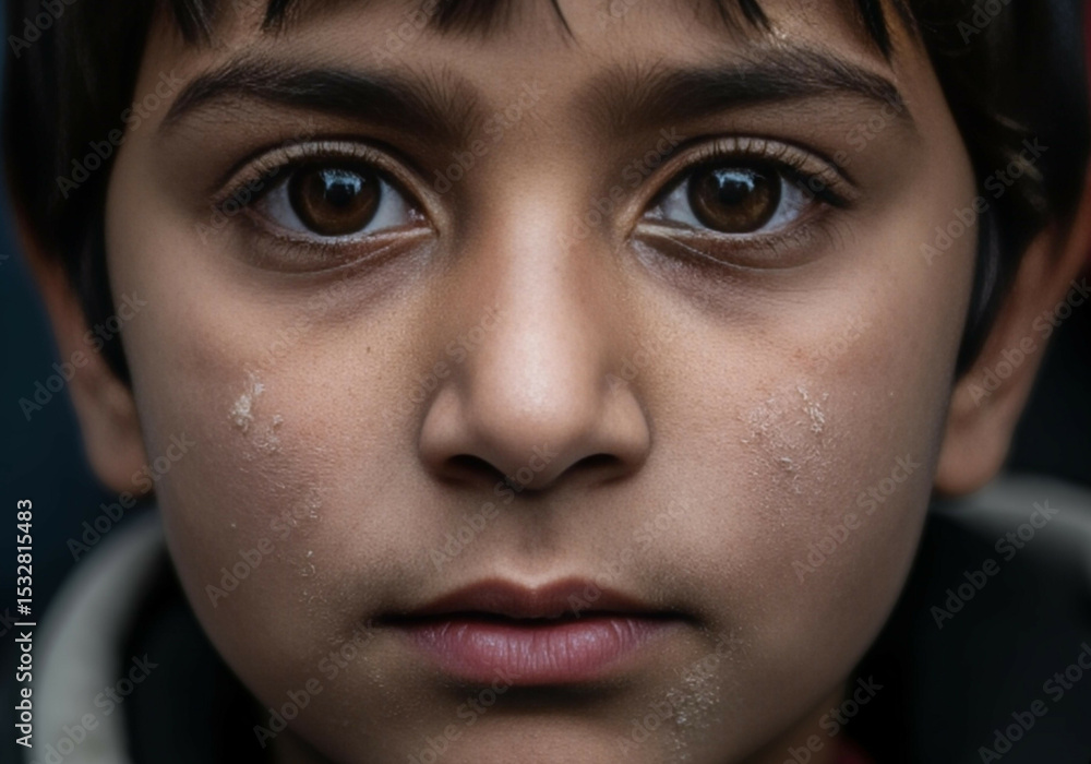 Ultra-close-up of a refugee child’s face with deep, expressive eyes, dust on cheeks, natural backlight catching the eyes #1532815483