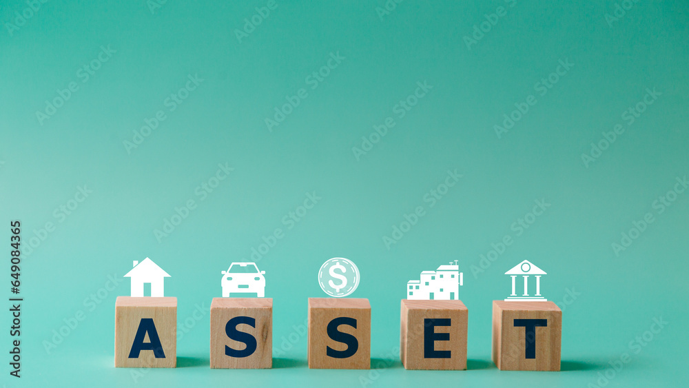 Wooden cubes with assets icon on background, Asset management and financial accounting, House and property investment and asset management, Interest rates, Loan mortgage #649084365