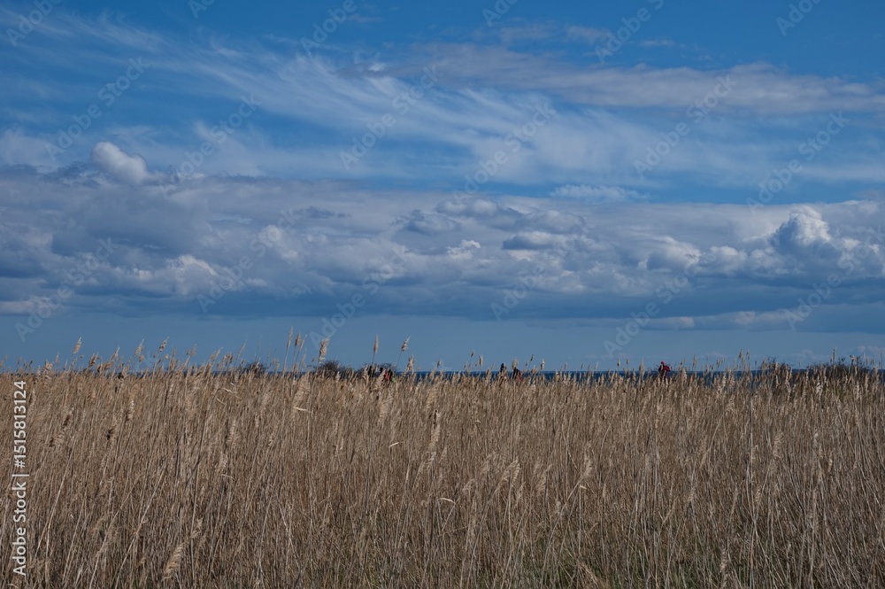 Yellow reed in the field with unrecognizable people walking behind it #1515813124