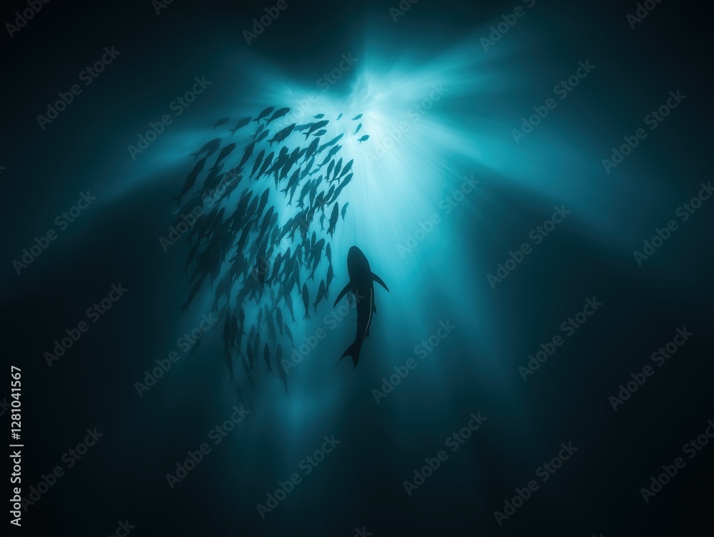 a silhouette of a shark swimming towards a school of fish in deep blue water. #1281041567