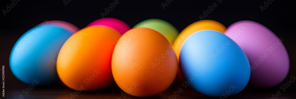 Brightly colored eggs arranged on a dark background, showcasing vibrant hues and textures, evoking festive cheer. #1229109188