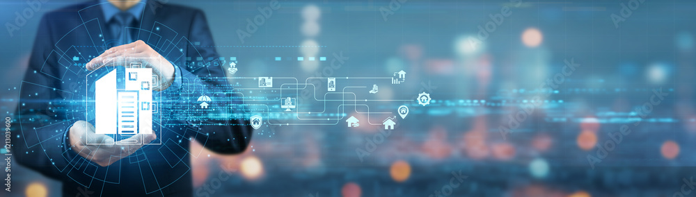 Businessman holding Property Management oversees the day-to-day operations of residential or commercial properties, such as rent collection maintenance and tenant relations to maximize property value. #1213039600