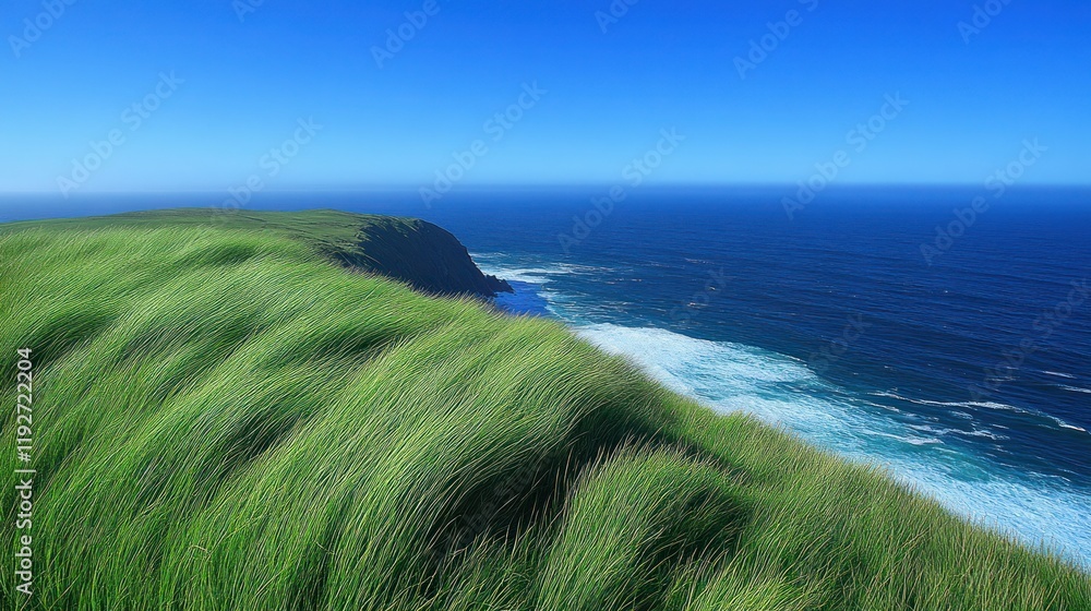 Coastal grass blowing in the wind, overlooking ocean. #1192722204
