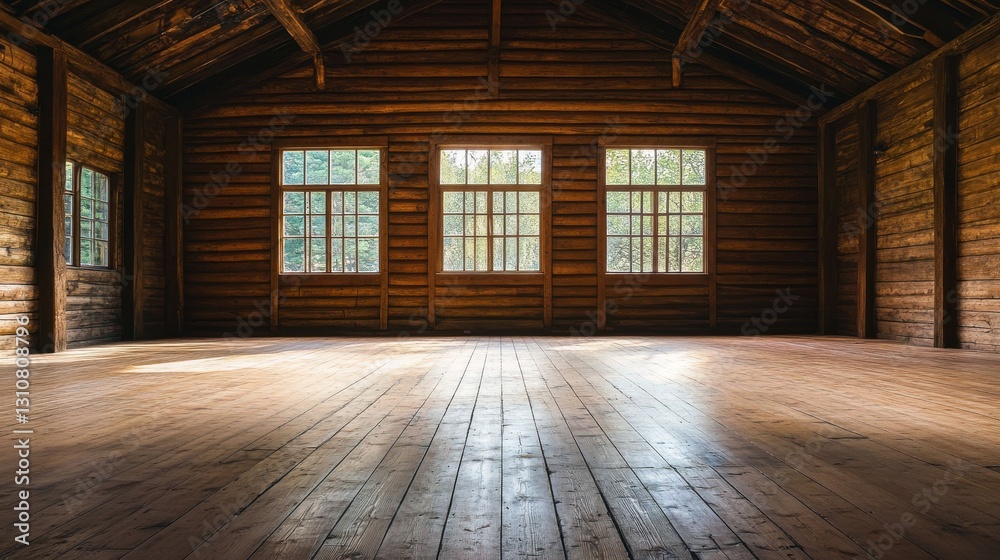 Empty rustic wooden cabin interior with large windows. Ideal for showcasing rustic designs, furniture, or peaceful settings. #1310808796