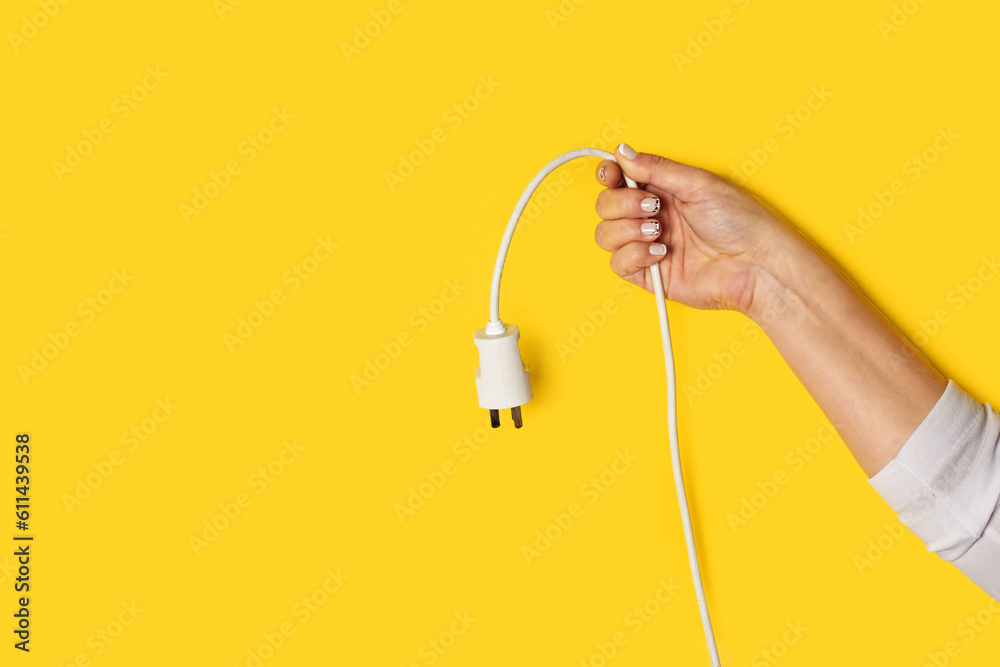 Mano de mujer sosteniendo un enchufe conector sobre un fondo amarillo liso y aislado. Vista de frente y de cerca. Copy space #611439538