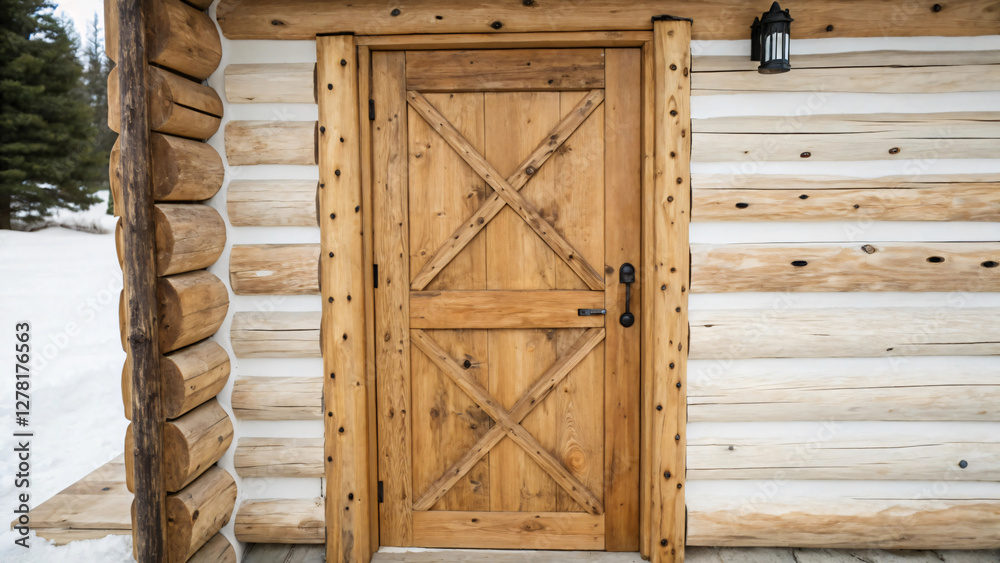 Rustic wooden door against log cabin structure with snow-covered ground nearby #1278176563